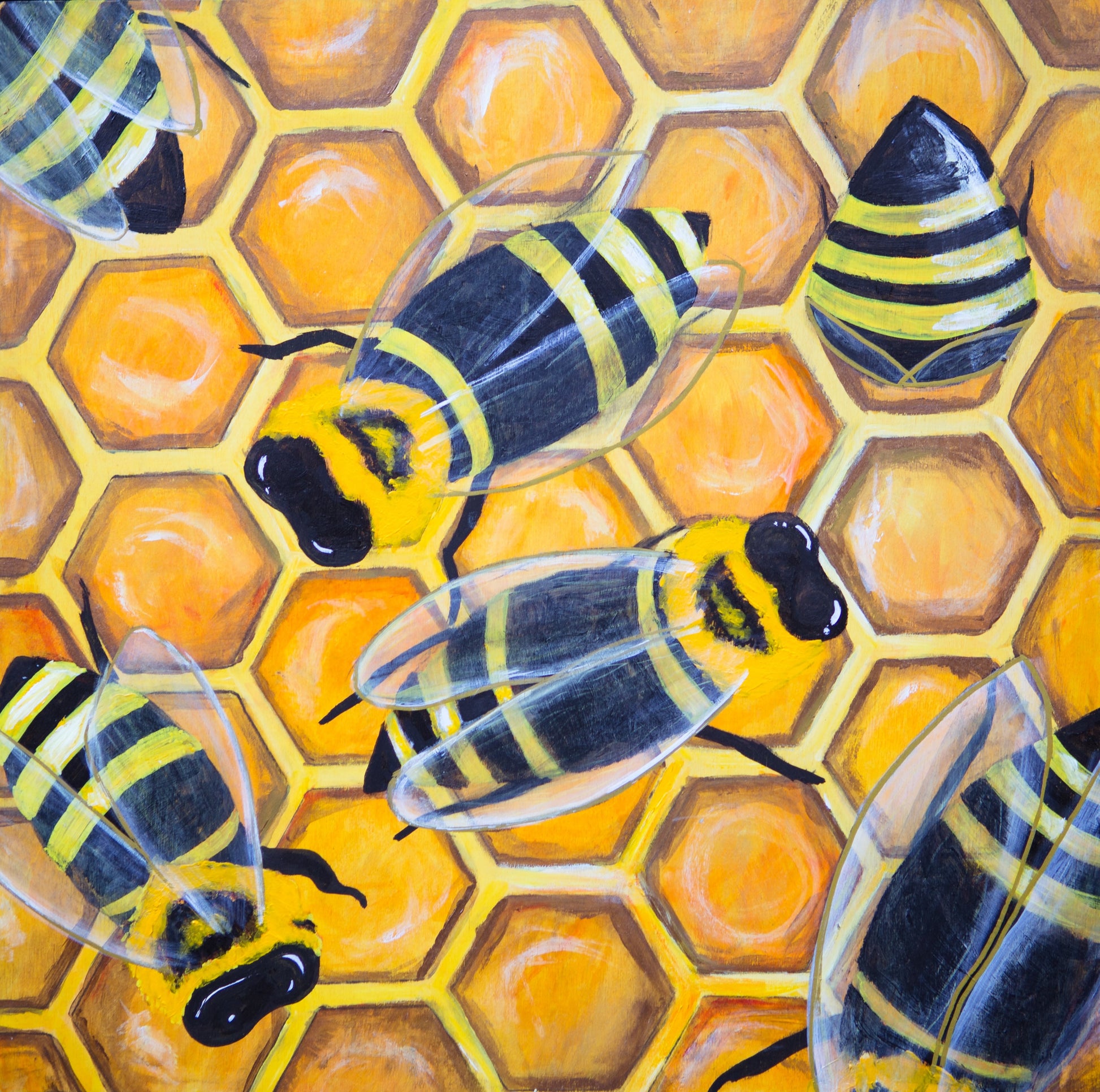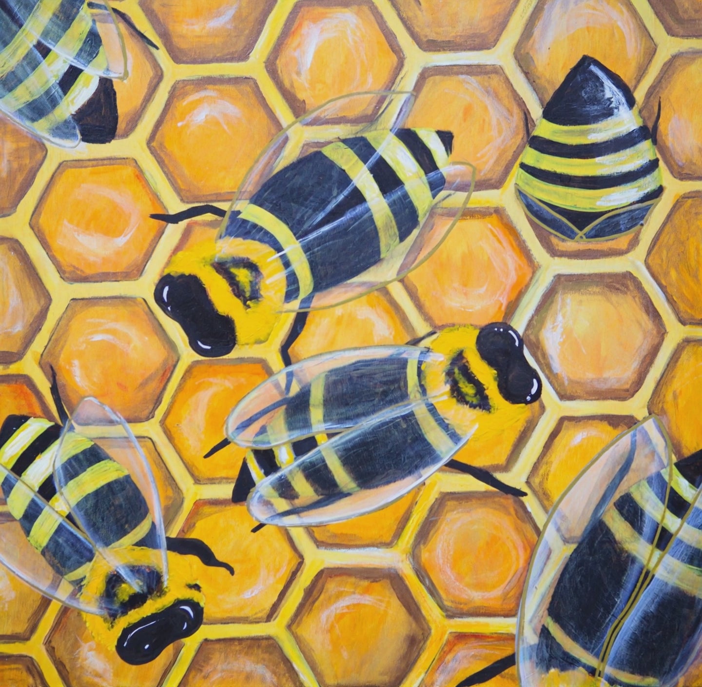 This 14x14" acrylic painting on birch board captures that spirit, depicting bees as they build honeycomb together. With the help of AI, the piece comes alive—adding movement and dimension to their story. Experience the buzz on my augmented reality site.