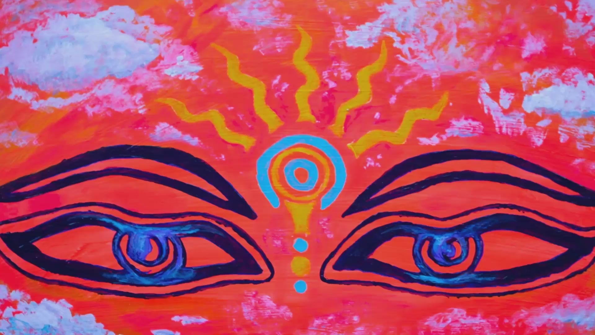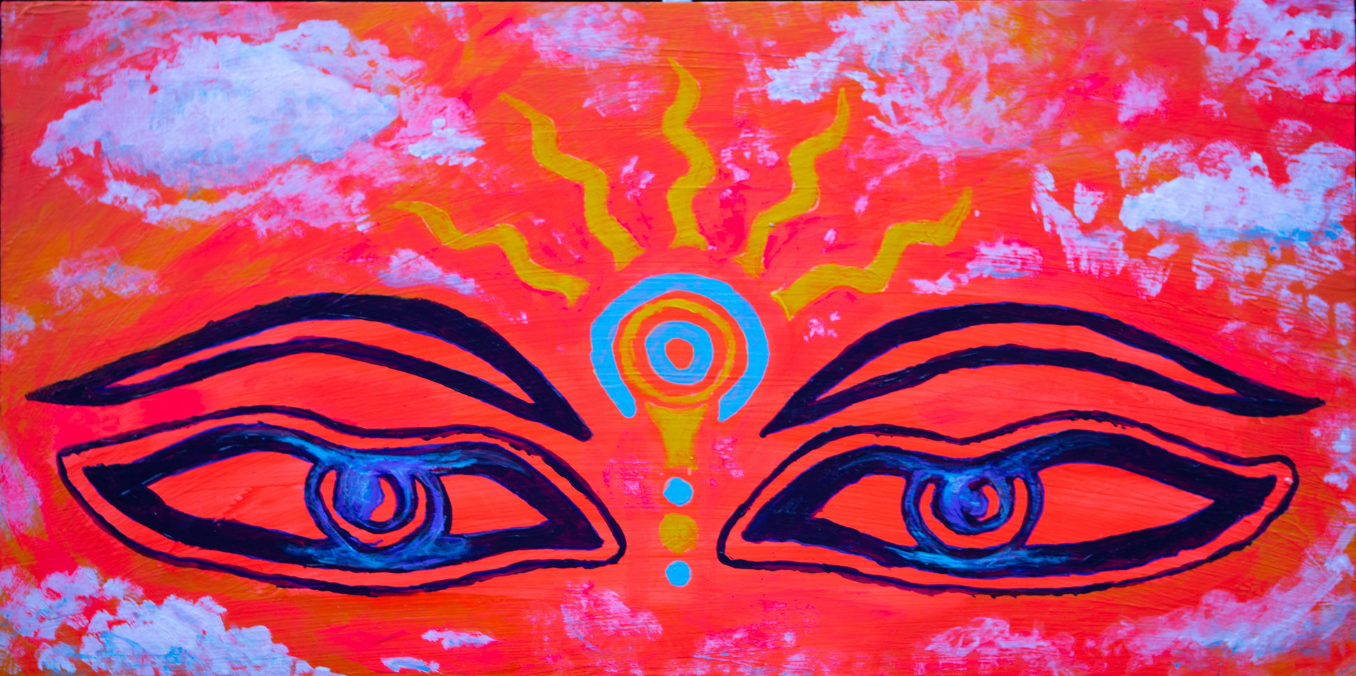 Inspired by the symbolic Buddha eyes, this 12x24" acrylic painting represents spiritual awareness and inner vision. The dot between the eyes — traditionally symbolizing enlightenment — has been reimagined as a glowing lightbulb, a modern spark of awakening.