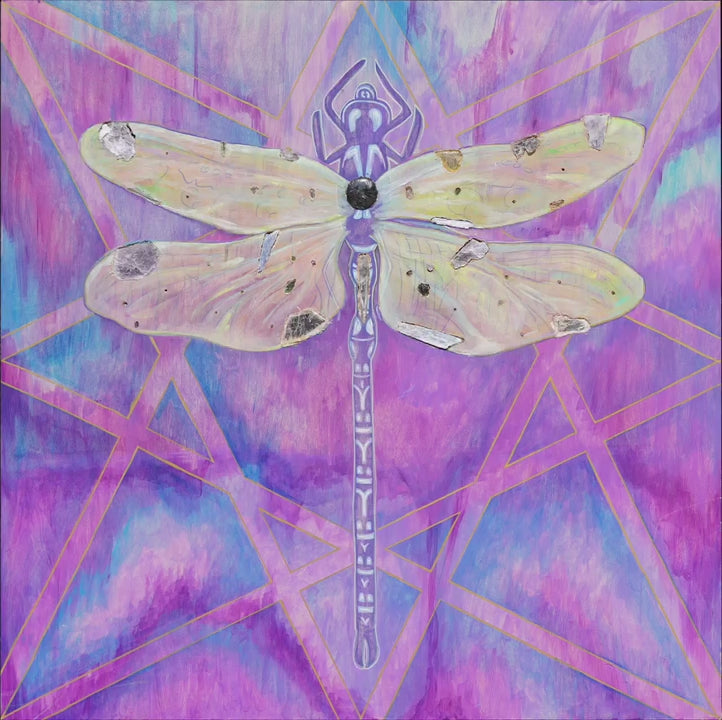 This ethereal piece showcases a delicate dragonfly hovering above an eight-pointed star, surrounded by soft pastel hues. Embedded within the painting are sacred stones and crystals, each carefully collected from Mount Shasta and cleansed in the waters of Medicine Lake under the moon’s glow. The dragonfly, a symbol of transformation and light, pairs with the eight-pointed star, often representing balance, spiritual awakening, and cosmic harmony. "Moonlit Ascension" weaves together the mystic energy of nature, inviting viewers to experience the gentle yet powerful essence of a world touched by sacred light and stone.